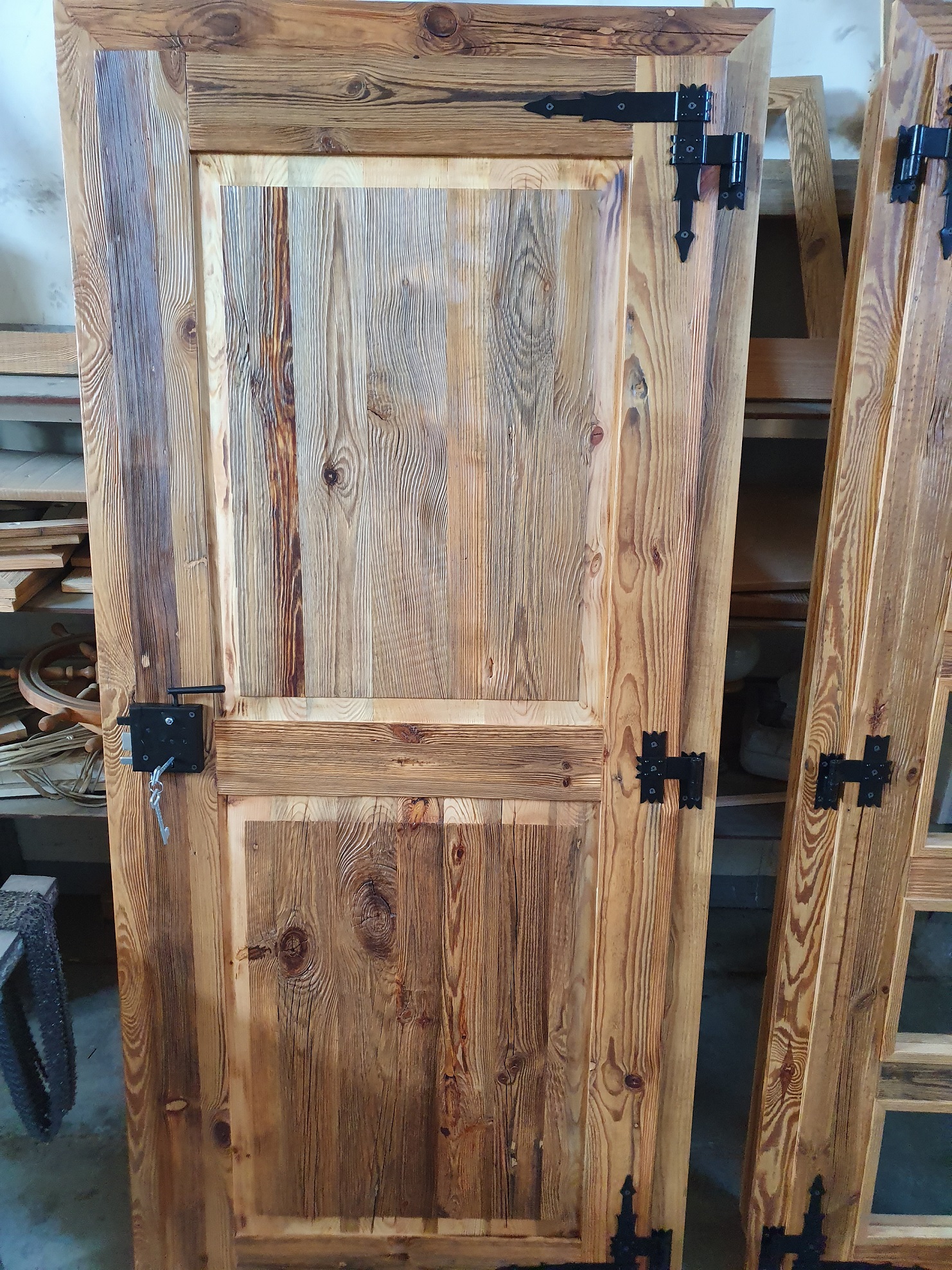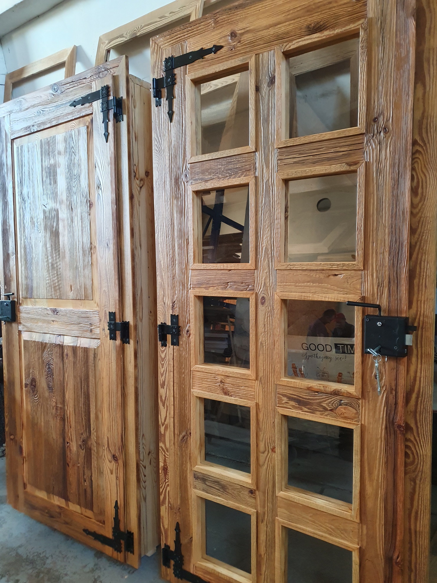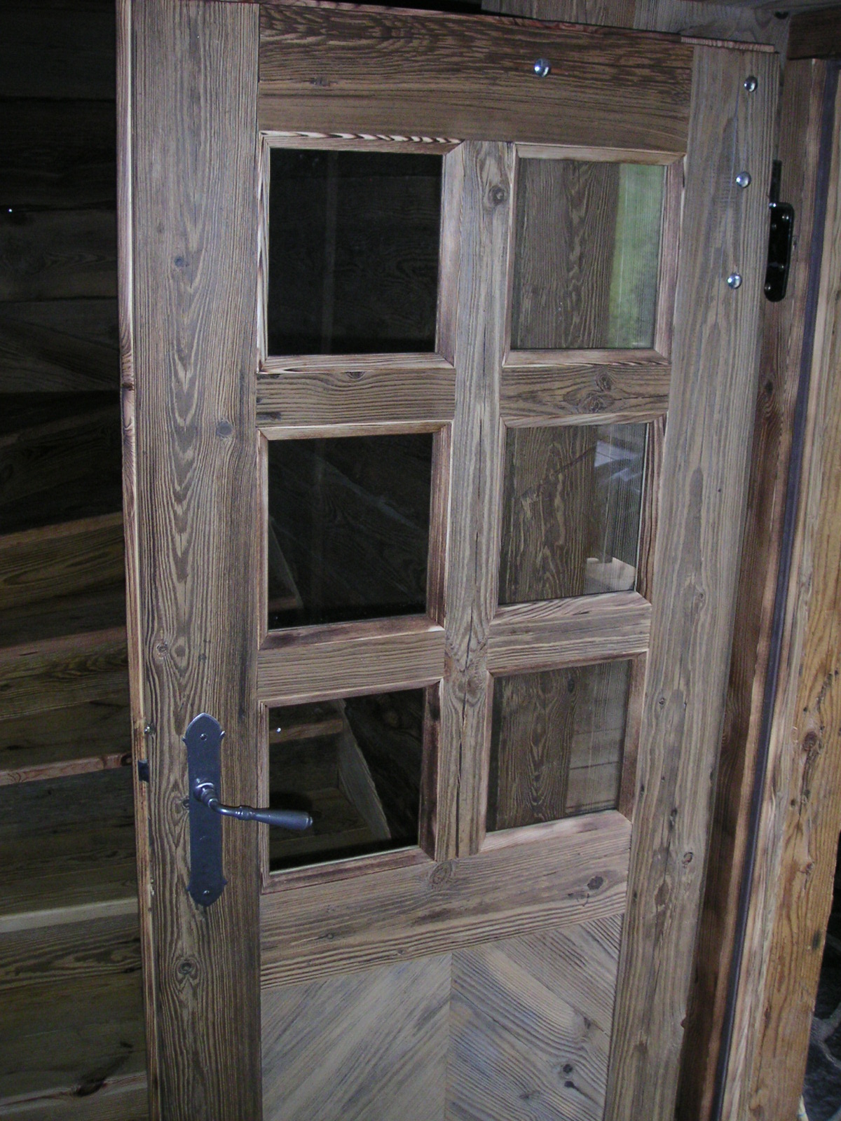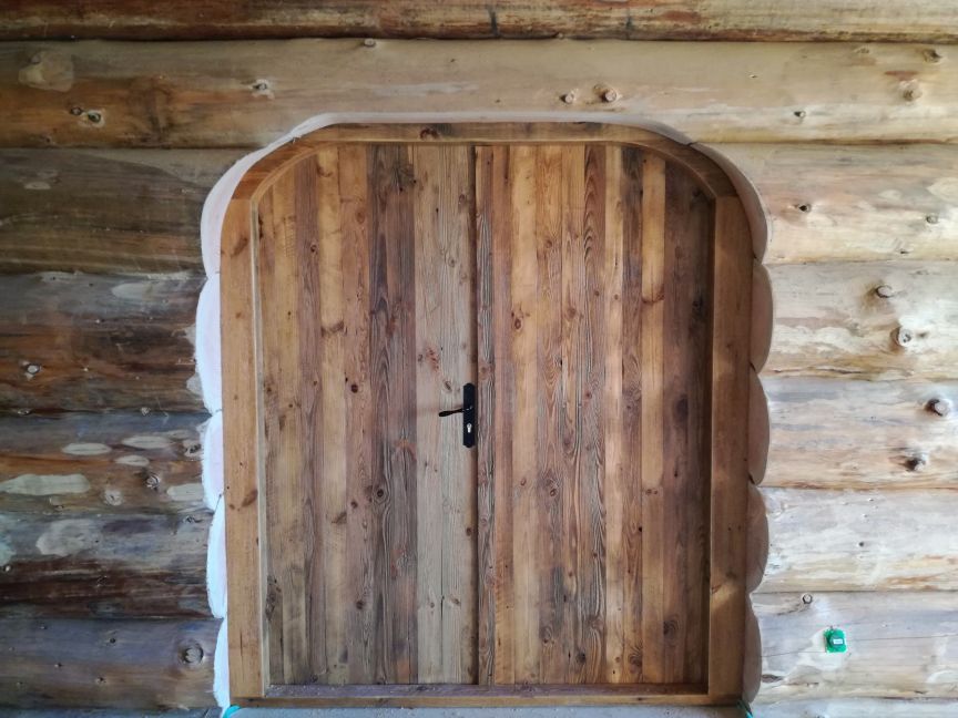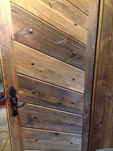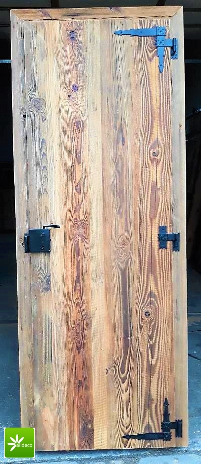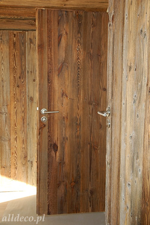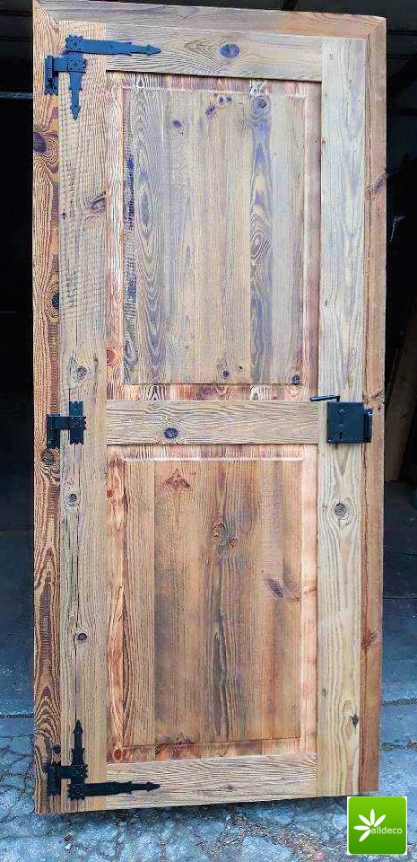 Drzwi wykonujemy metodą rzemieślniczą. Konstrukcja oparta jest na ramiaku, z warstwą wierzchnią ze starego drewna oraz izolacją foniczno-termiczną.