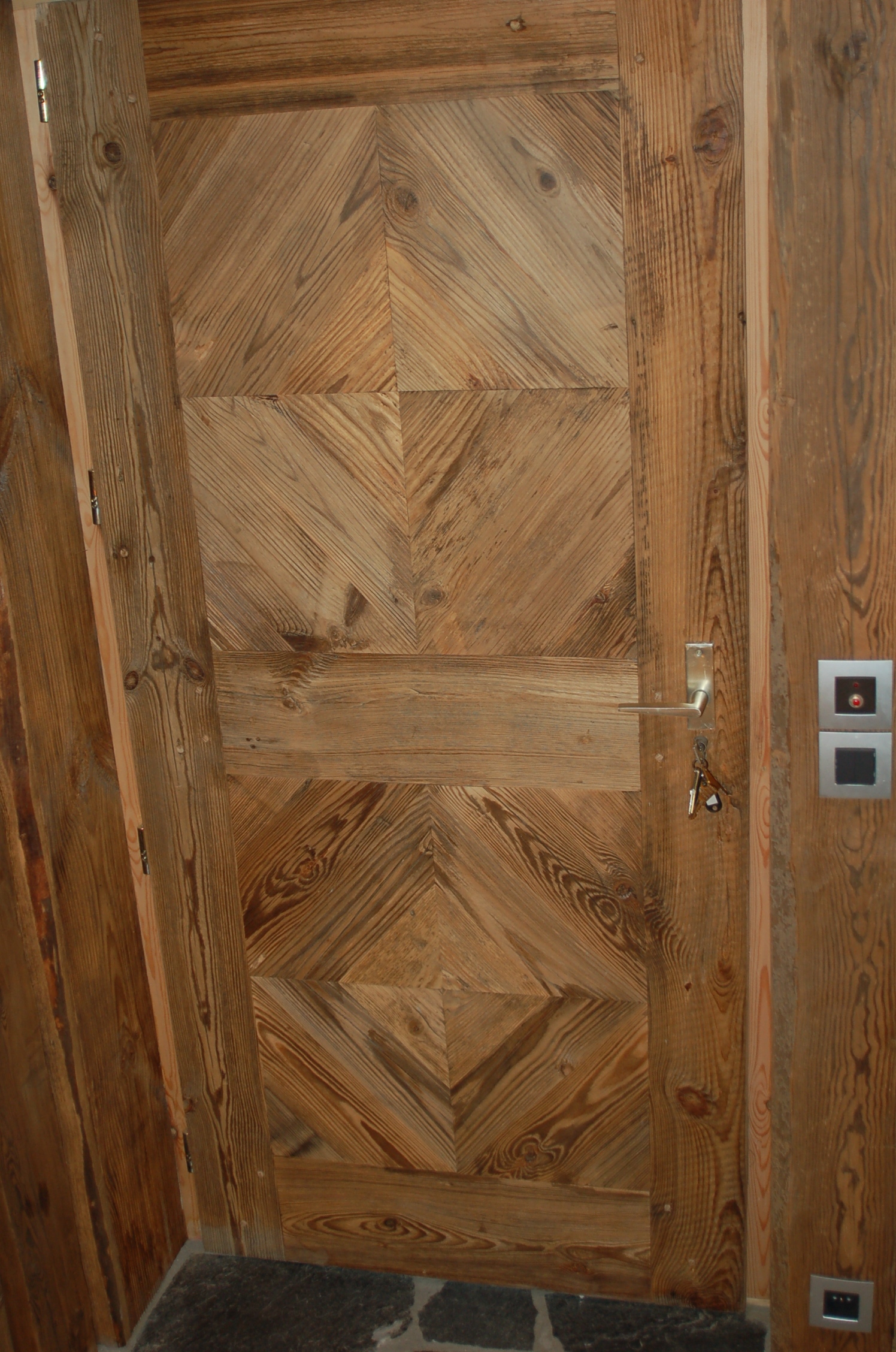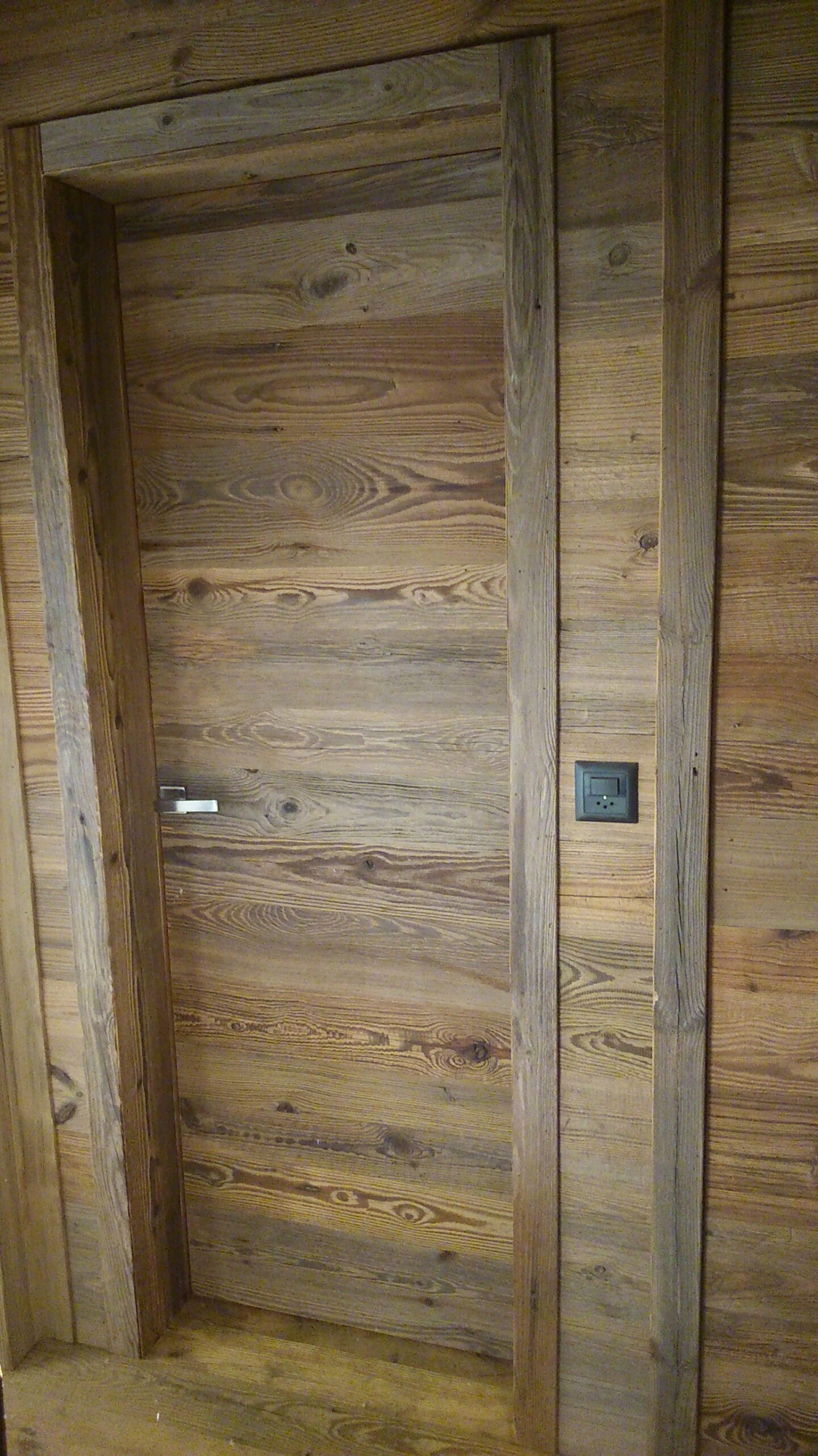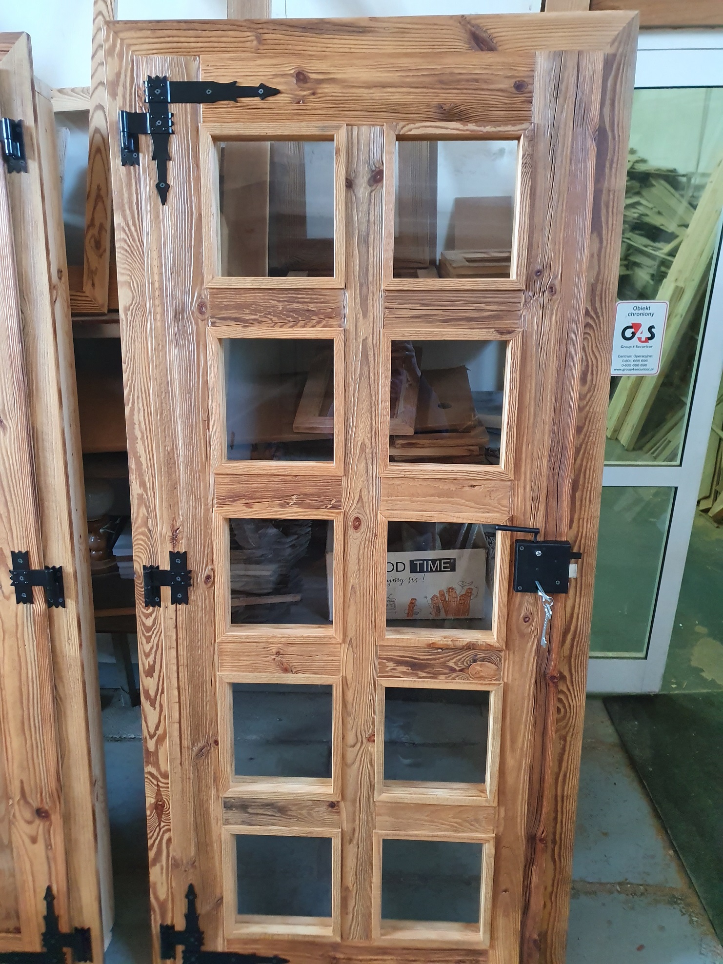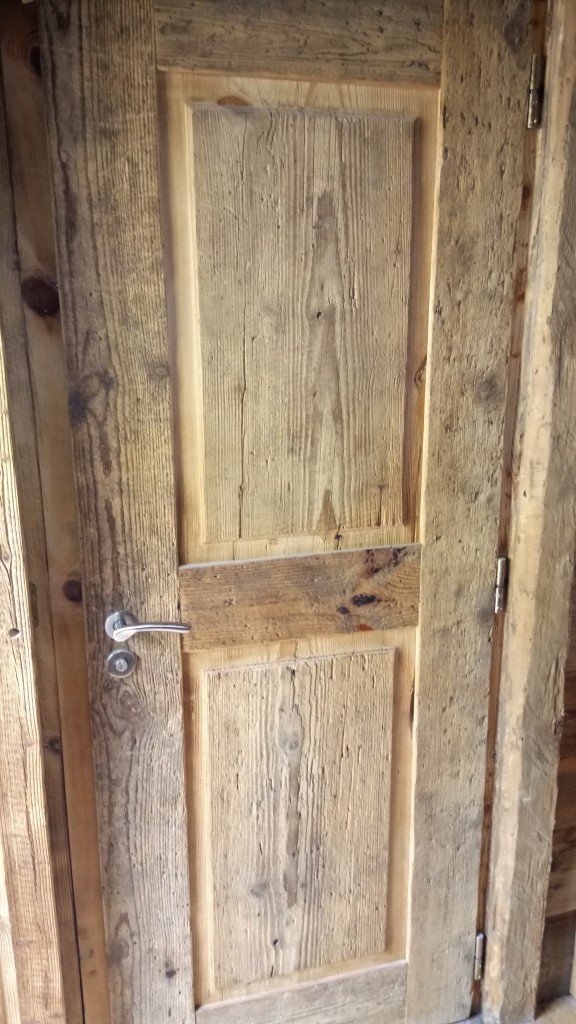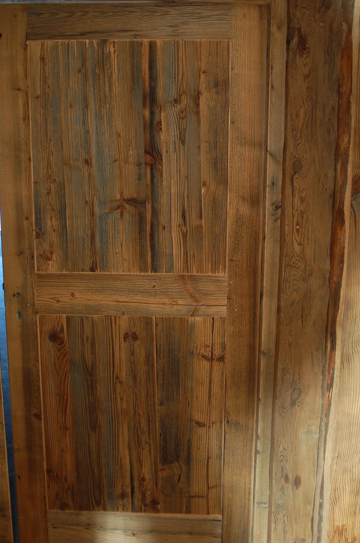 Drzwi wykonujemy metodą rzemieślniczą. Konstrukcja oparta jest na ramiaku, z warstwą wierzchnią ze starego drewna oraz izolacją foniczno-termiczną.