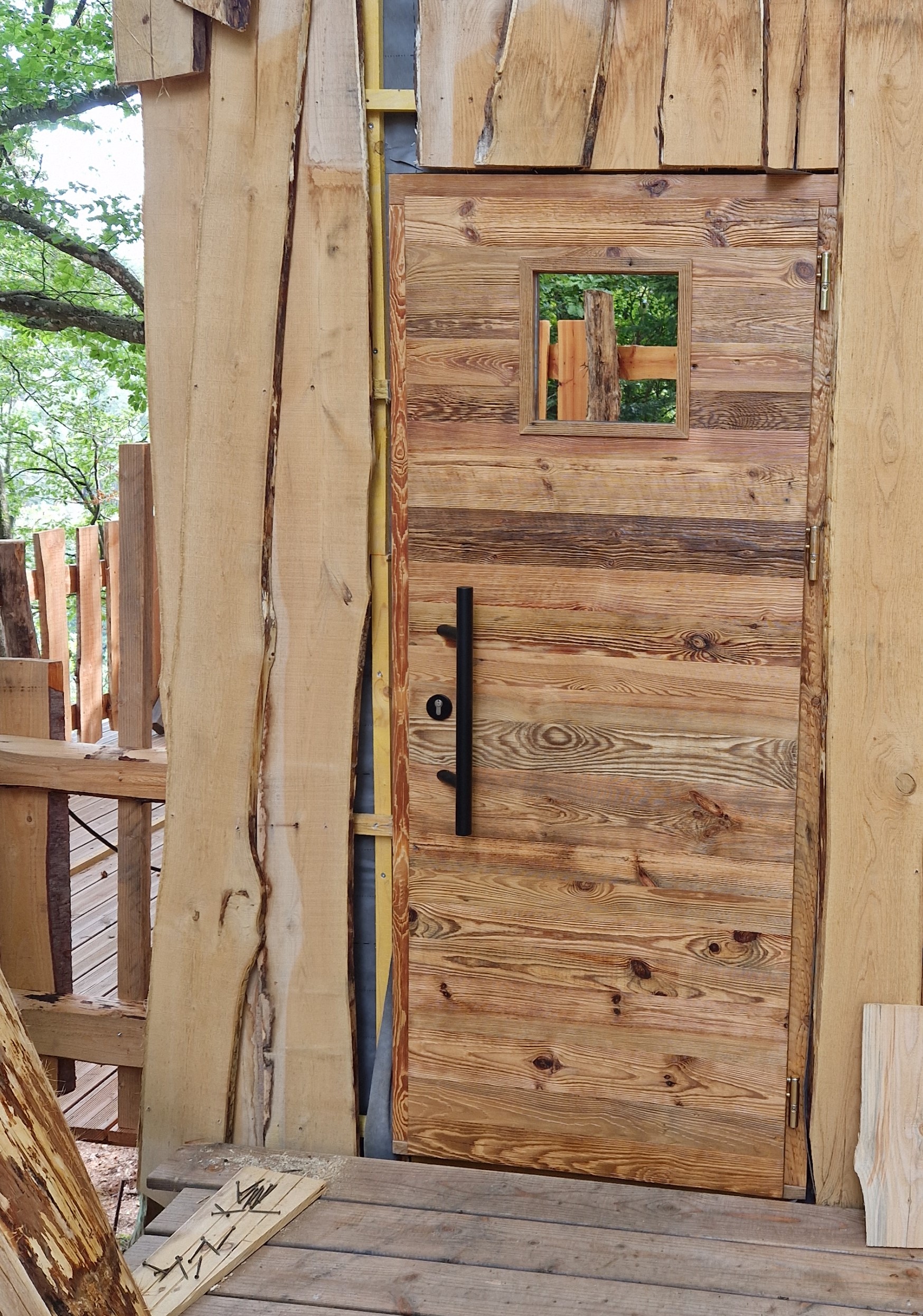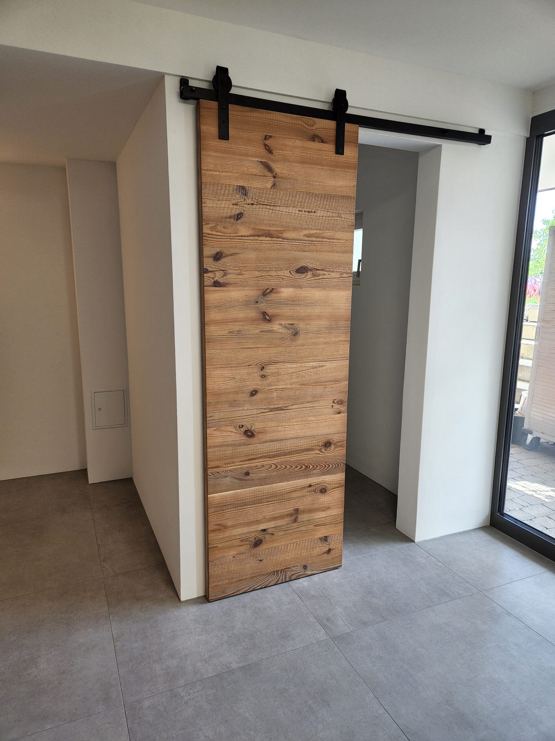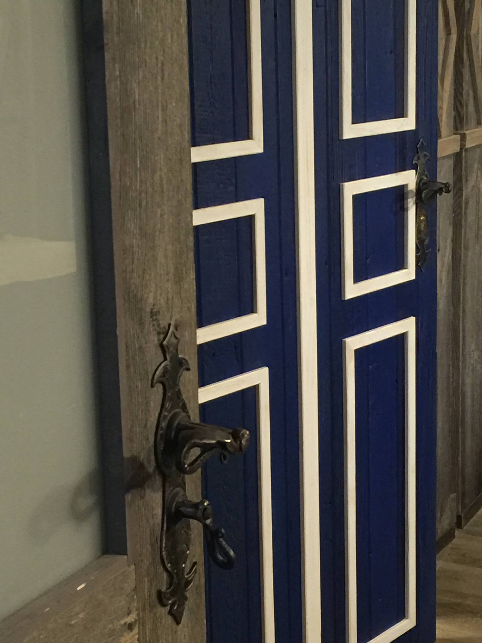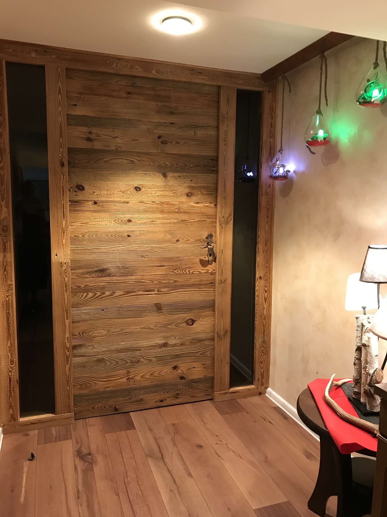 Drzwi wykonujemy metodą rzemieślniczą. Konstrukcja oparta jest na ramiaku, z warstwą wierzchnią ze starego drewna oraz izolacją foniczno-termiczną.
