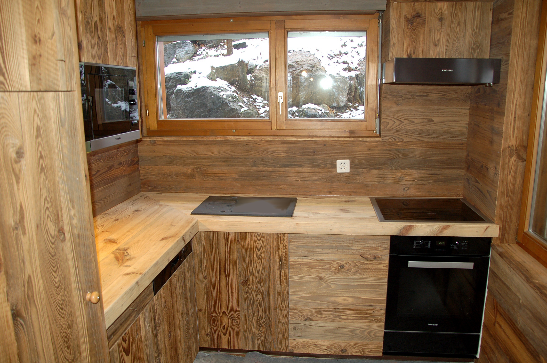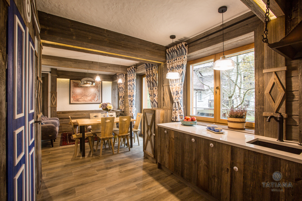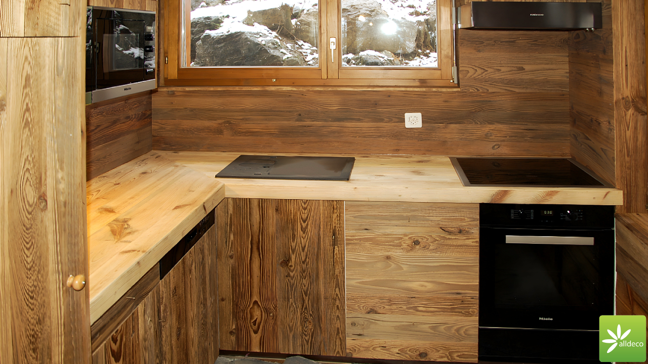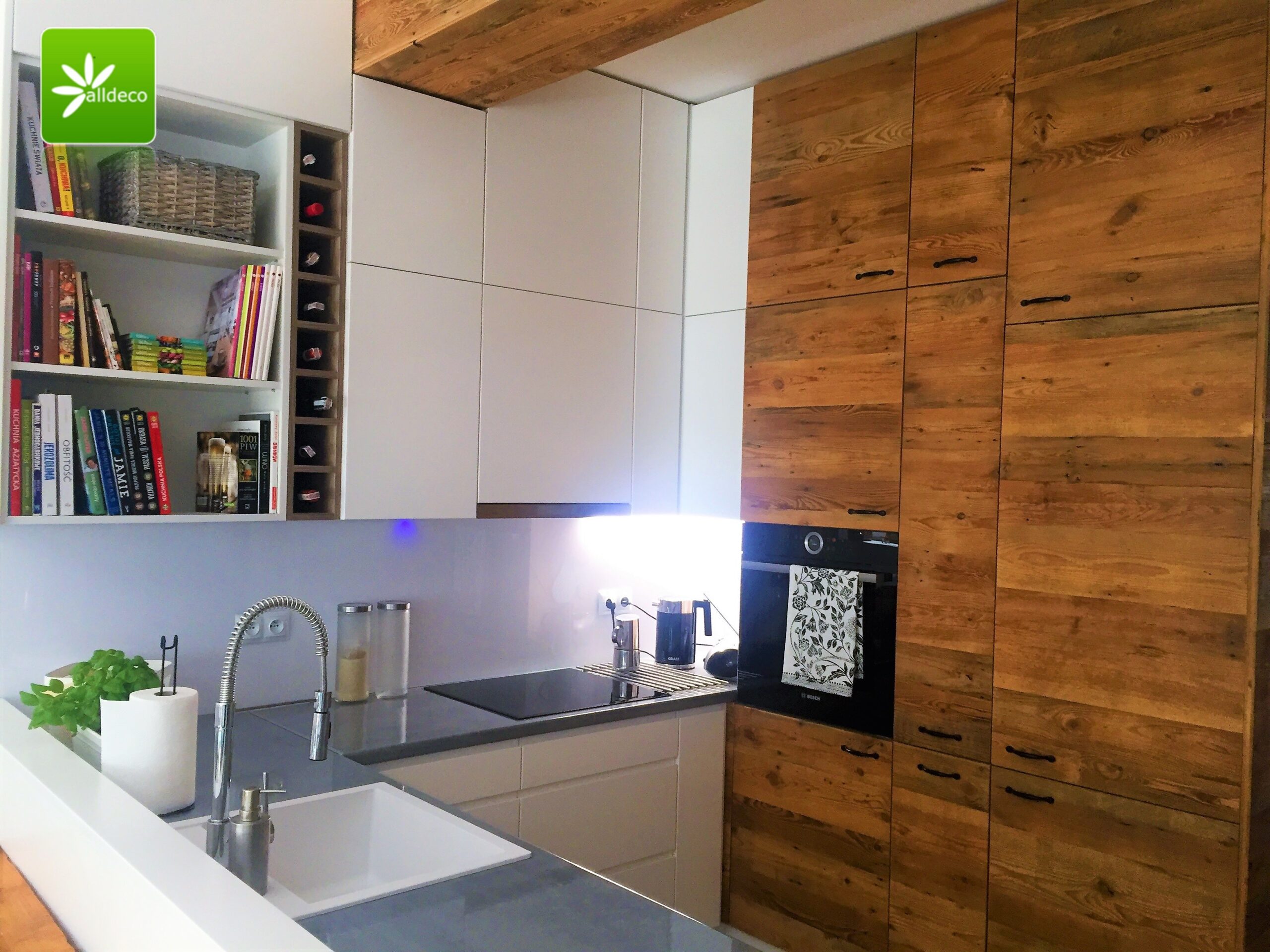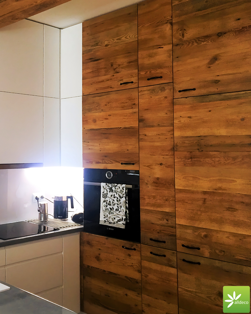 W przypadku frontów mebli płyty są docinane na wymiar, boki oraz tył wybarwiany pod kolor starego drewna.