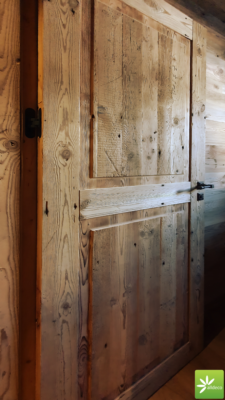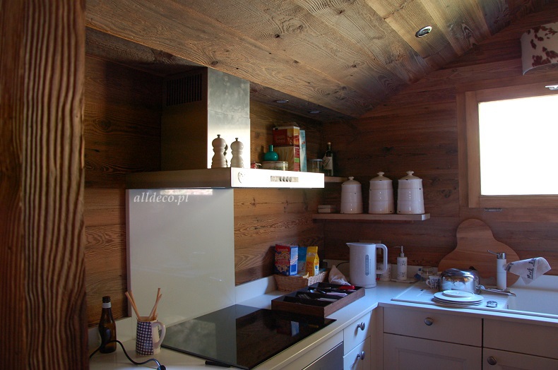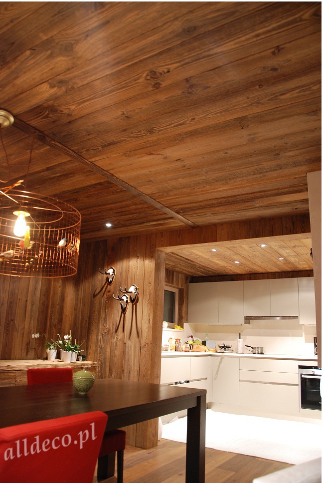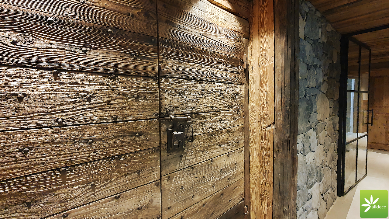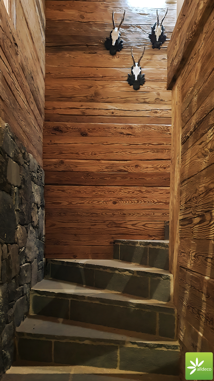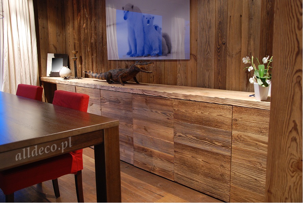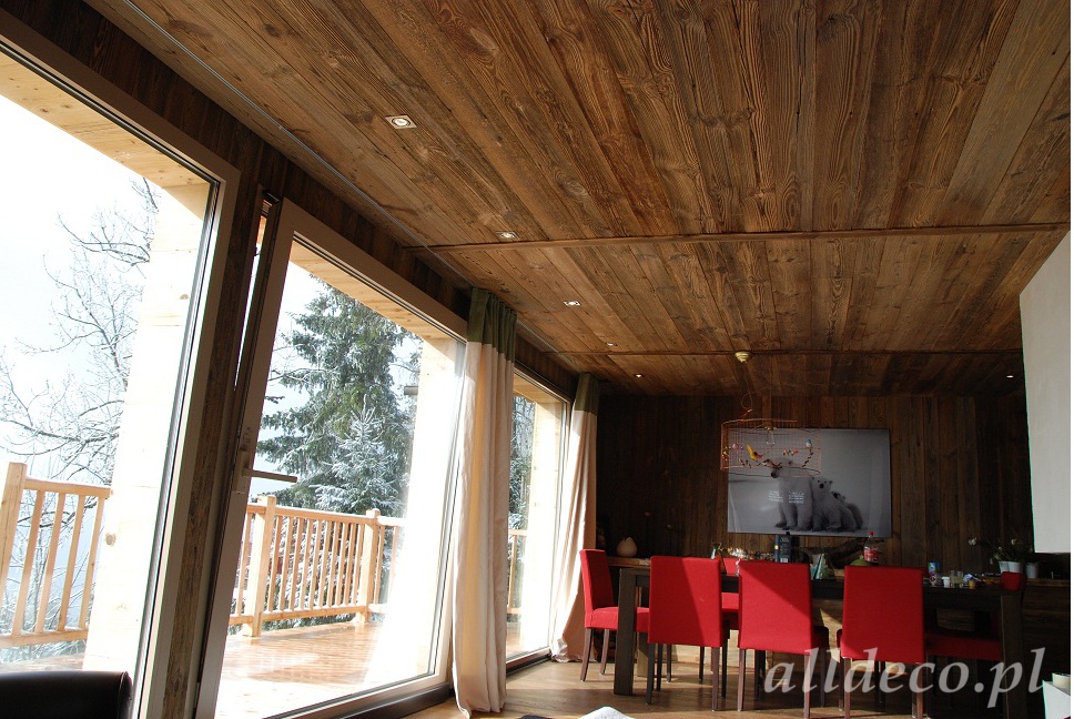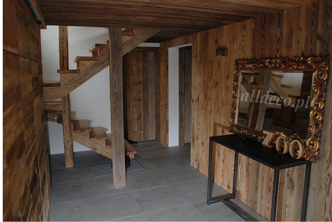 Do wnętrz budynków stosujemy starą deskę o naturalnym wybarwieniu – brązowym lub siwym, w zależności od potrzeb klienta. Deska jest montowana na listwach i łączona na pióro-wpust lub na zakładkę. Drewno, na życzenie klienta, może zostać zaimpregnowane powierzchniowo przeciwko insektom i grzybom.