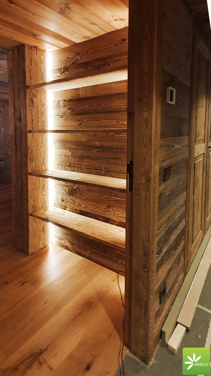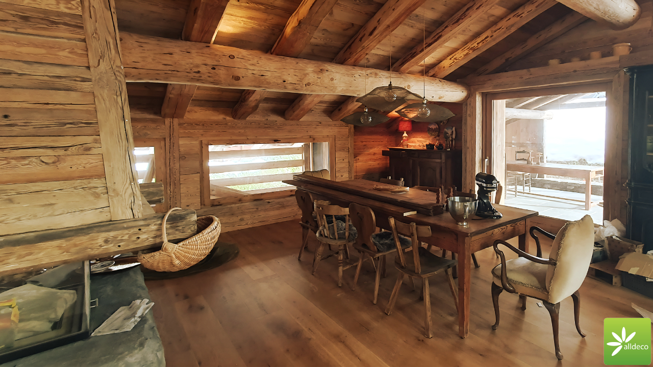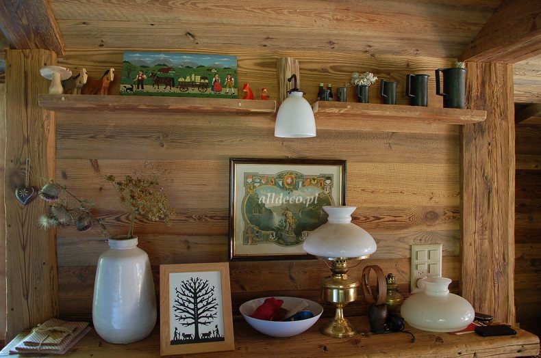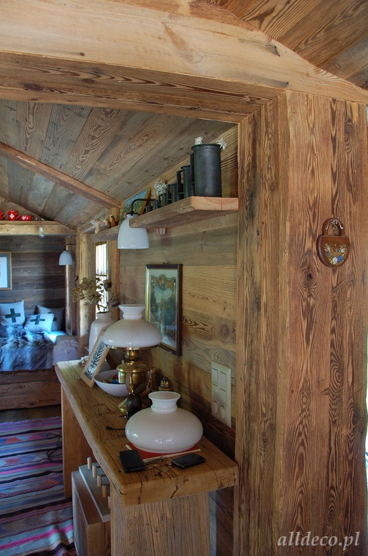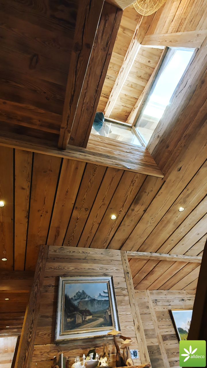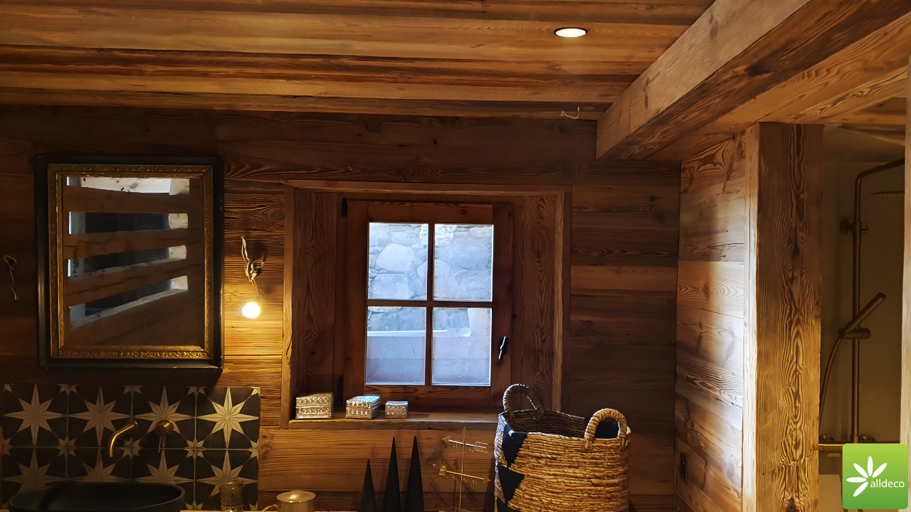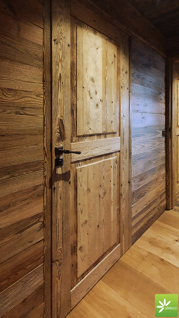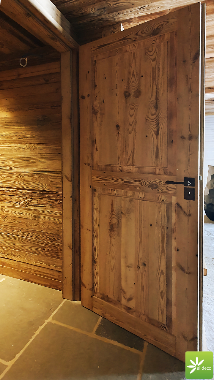 Do wnętrz budynków stosujemy starą deskę o naturalnym wybarwieniu – brązowym lub siwym, w zależności od potrzeb klienta. Deska jest montowana na listwach i łączona na pióro-wpust lub na zakładkę. Drewno, na życzenie klienta, może zostać zaimpregnowane powierzchniowo przeciwko insektom i grzybom.
