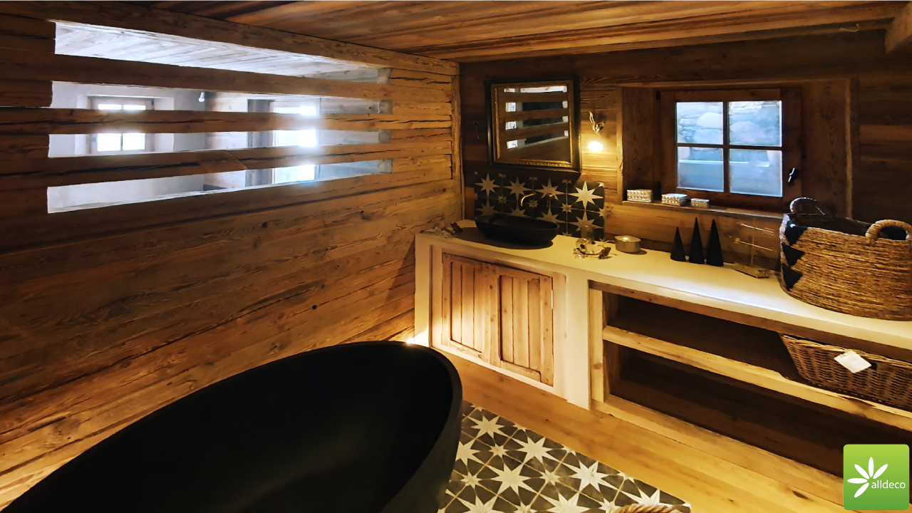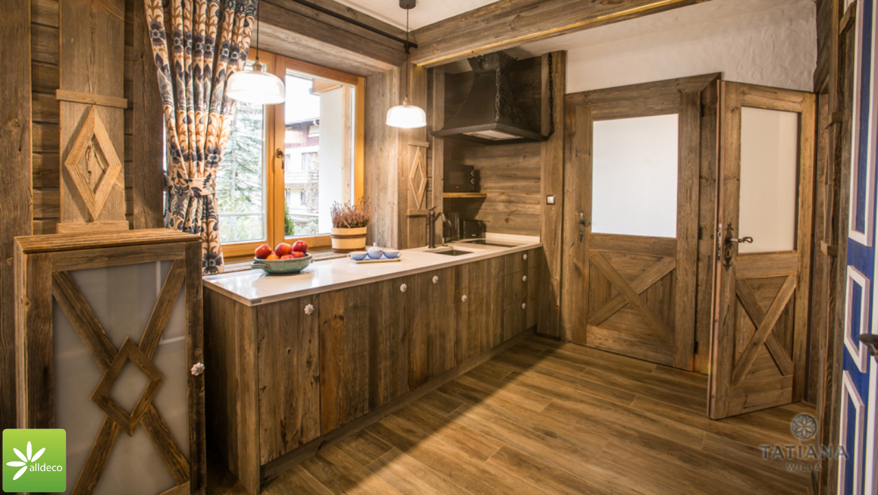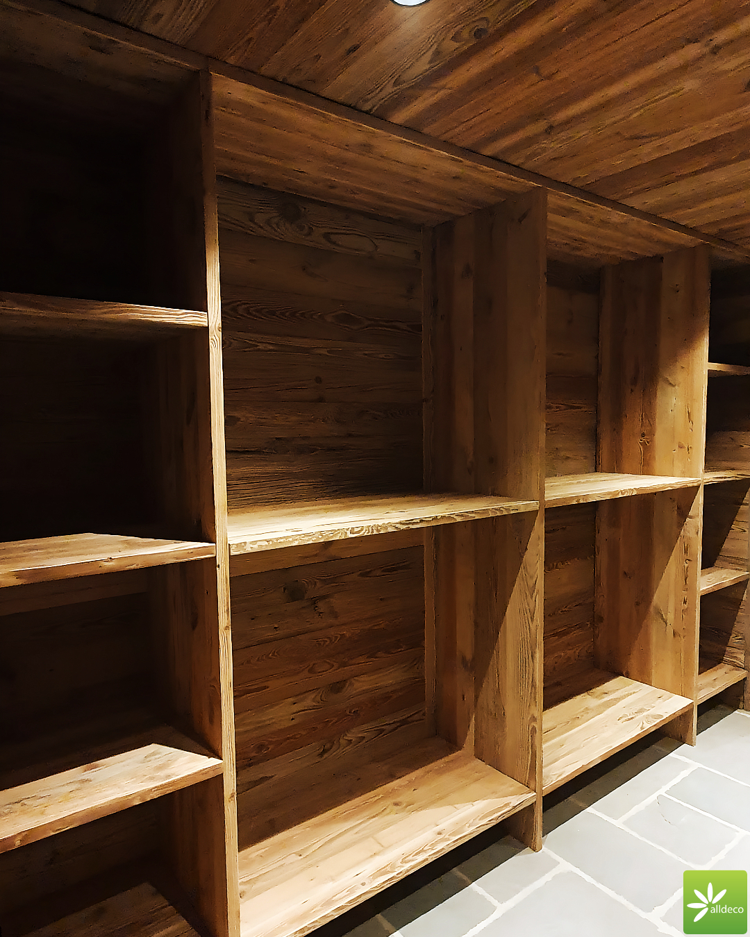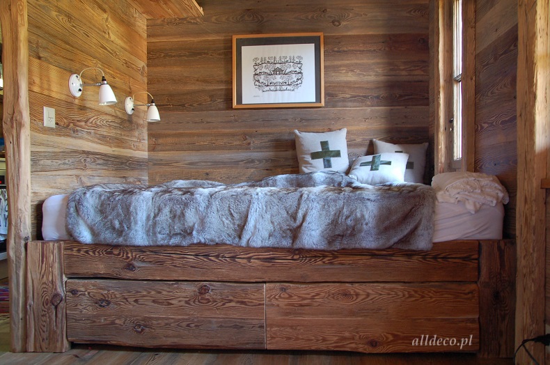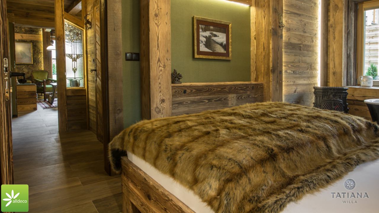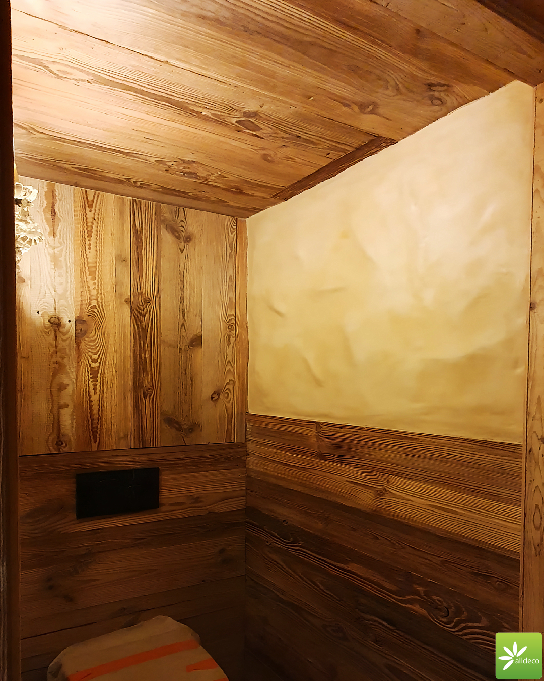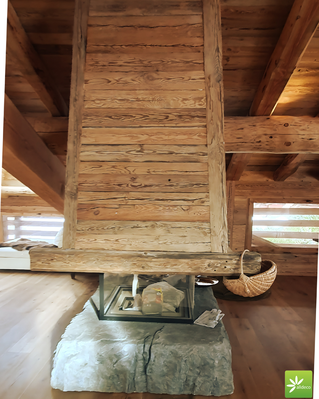 Do wnętrz budynków stosujemy starą deskę o naturalnym wybarwieniu – brązowym lub siwym, w zależności od potrzeb klienta. Deska jest montowana na listwach i łączona na pióro-wpust lub na zakładkę. Drewno, na życzenie klienta, może zostać zaimpregnowane powierzchniowo przeciwko insektom i grzybom.